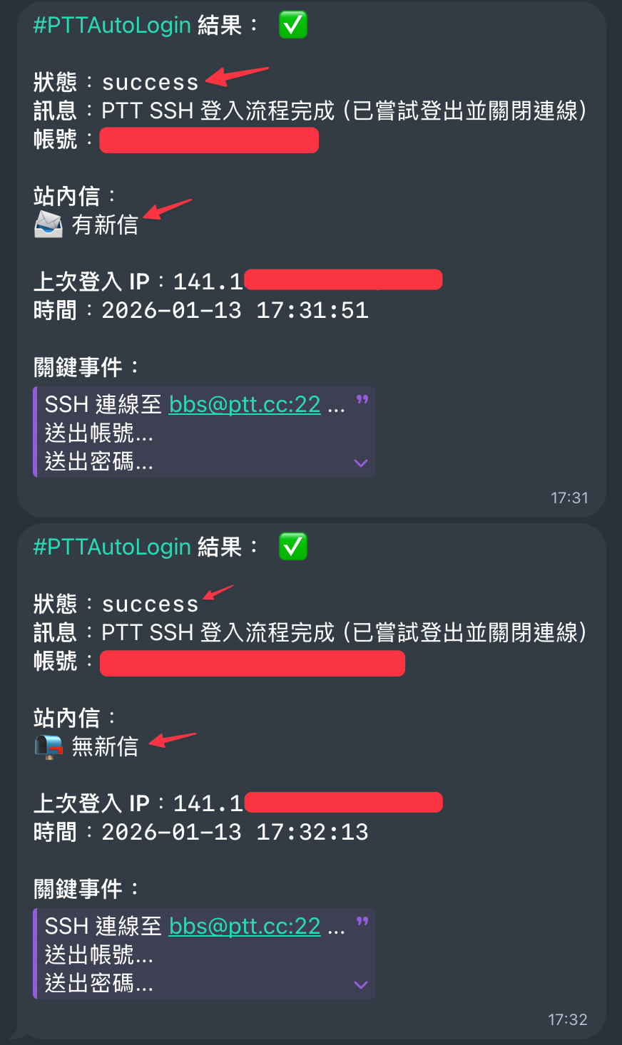 之後 n8n 就會每天在你設定的時間自動 PTT 登入並且登出了,並且還會順便幫你檢查有無站內信,實際收到的 Telegram 通知如下圖